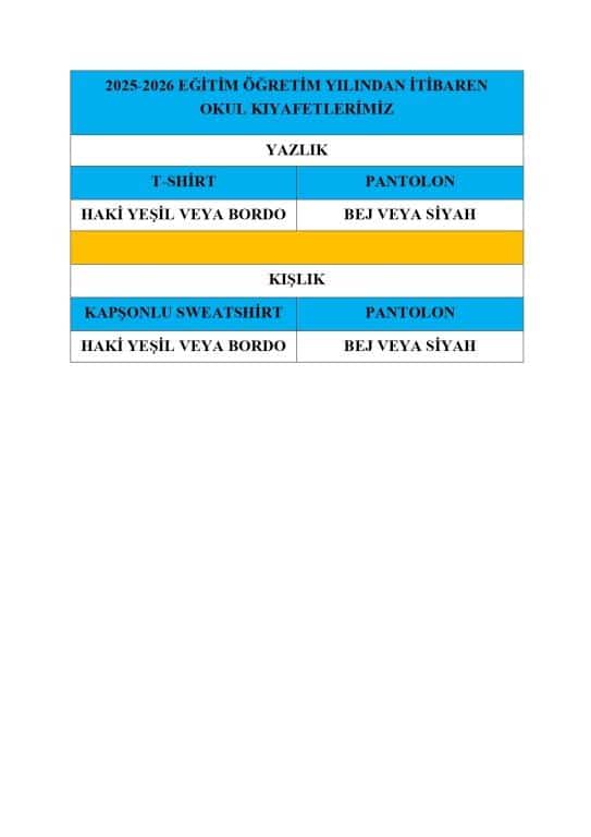 2025 2026 EĞİTİM ÖĞRETİM YILINDAN İTİBAREN OKUL KIYAFETLERİMİZ